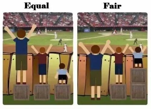 首先我们看一下平权法案支持者最常用的一张图,即平等(Equal)与公平(Fair)的区别。这张图的本意是说明平等对待有时候并不公平,对于弱势群体给予一定优待才能实现公平。这个理念并没有错,现代社会的福利制度,包括中国给予少数民族聚集区的少数民族考试加分政策,都是基于这种理论。但是这种理论自身就带有副作用,在实施中又产生了更多的问题。