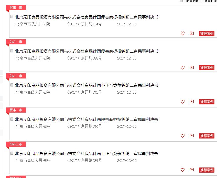 无印良品败诉的案子这一阵子成了热点,查了一下北京法院的网站,近期并没有关于无印良品的判决,在查了一下所有关于无印良品的判决,最近的一份也是2017年的了。多方检索,顺藤摸瓜,才知道这是港媒最近翻出了最年底的案子来了。